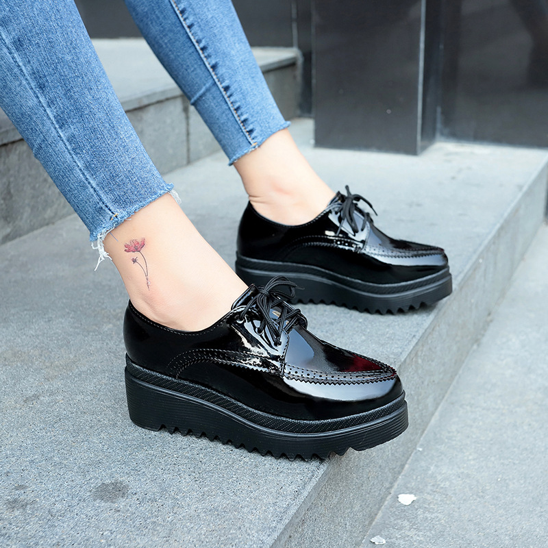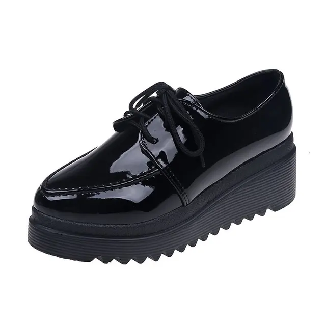 Women Oxford Shoes Lace Up Platform Shoes Black Patent Leather Casual Shoes Thick Sole Shoes Ladies Wedges